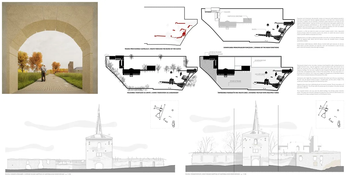 Propunerea are la bază patru idei principale: crearea unui traseu prin castel, împărțirea parcelei în mai multe zone funcționale, folosirea vegetației înalte pentru a crea limite atât în interiorul parcelei cât și pentru a delimita zona de intervenție, și împărțirea zonelor exterioare în mai multe curți care deservesc clădirile aferente. Traseul are rolul de a purta vizitatorul prin toate spațiile castelului și de a oferi acestuia perspective asemănătoarea cu cele ale familiei Kornis. Traseul joacă atât rol de meterează cât și rol de balcon, iar în unele zone sugerează dispariția unor ziduri de apărare dărâmate. Acesta formează o legătură între toate corpurile castelului.