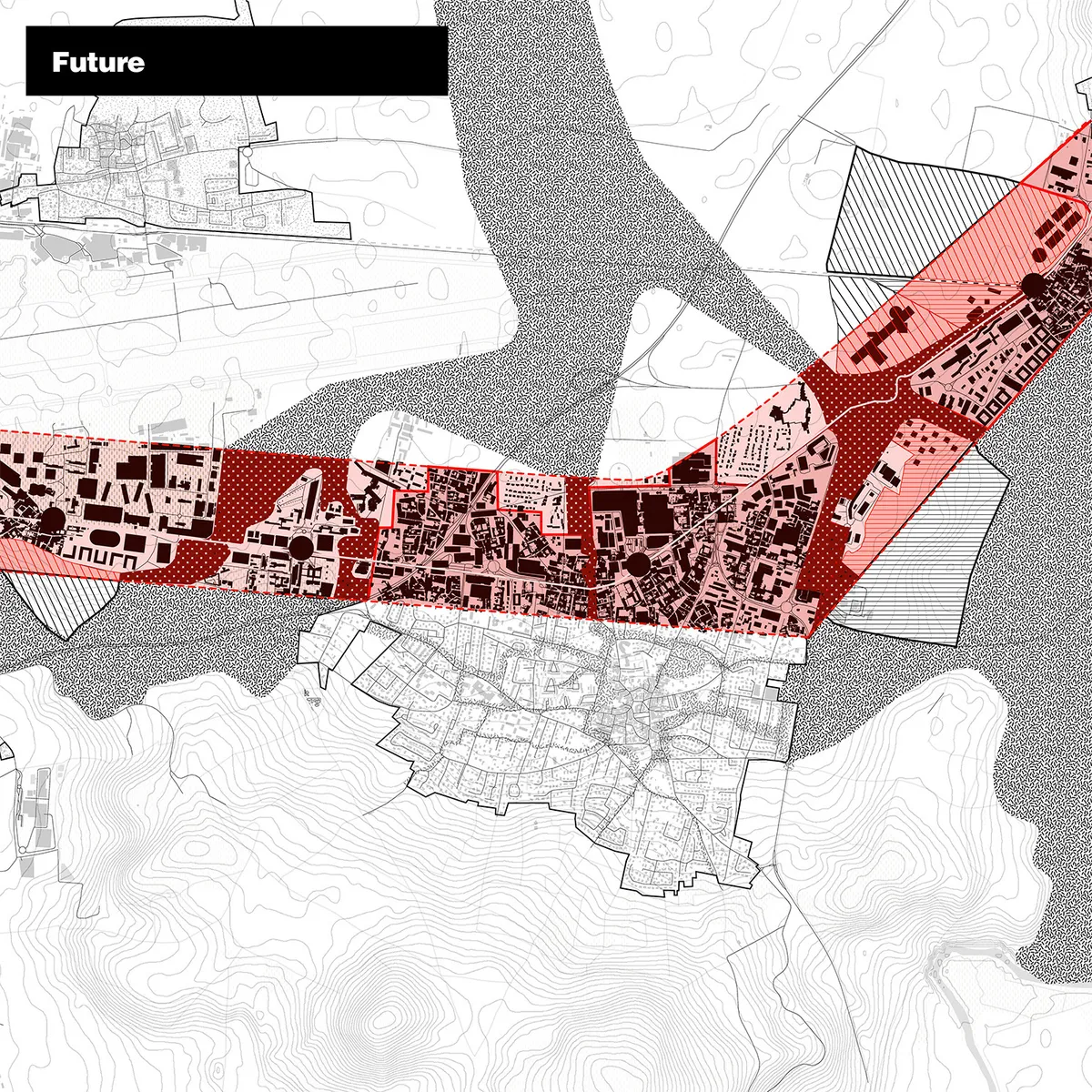 Cum ar fi dacă industria nu ar părăsi orașele noastre, nu ar fi tratată ca o barieră, ignorată sau lăsată în voia sorții? Dacă am regândi-o ca pe o infrastructură de legătură, un generator de inovare, un centru social și educațional, un facilitator și mai presus de toate, o reacție în lanț. Teritoriul care înconjoară Clermont-Ferrand este împărțit pe verticală în zone naturale și agricole, cu mici concentrări de urbanizare locală împrăștiate între câmpuri. Expansiunea industrială actuală invadează zona mono agricolă sub forma unor ramuri de producție care se întind de-a lungul drumurilor care le leagă satele între ele. Scopul proiectului este de a profita de potențialul urbanizării liniare în curs de dezvoltare identificate ca o rețea naturală ce poate crește spre est. Benzile de 400 de metri lățime, sunt propuse ca zone de legătură cu capacitatea unui program productiv diversificat, redistribuit în interiorul acestora. Polenizarea încrucișată ulterioară a educației, industriei și producției poate accelera inovarea, iar interconectarea va duce probabil la un schimb mai rapid de cunoștințe. Panglicile devin pestrițe cu destinații intermediare în locuri care înainte erau doar puncte de parcurs. Astfel, drumul anterior uniform se transformă într-o conexiune complexă și stratificată, cu un caracter diferențiat la nivel local, în funcție de intersecția sa cu regiuni de urbanitate, agricultură sau producție. Structura mai lejeră dizolvă granița, făcând-o mai poroasă, permițând potențial naturii să curgă prin ea. Prin intensificarea utilizării terenurilor, prin trecerea de la o structură de tip „stroad”, în care toate activitățile sunt ascunse într-un peisaj luminat de cutii mari, neprietenos pentru oameni și natură deopotrivă, și prin densificarea zonelor de producție, peisajul înconjurător este protejat. Atât terenurile agricole, cât și coridoarele naturale sunt eliberate de presiunea imobiliară. Infrastructura poroasă care se formează la intersecția coridoarelor naturale și de producție definește modelul nou imprimat peisajelor. Un sistem simplificat de mix-and-match pentru funcții ghidează poziționarea acestora în funcție de nivel, lățimea necesară a străzii, ciclul de utilizare de 24 de ore și amplasarea în raport cu strada. Utilizarea mixtă asigură o utilizare continuă, în timp ce activitățile se pot succeda fără fricțiune. Funcțiile perturbatoare pot fi incluse în peisajul de producție într-un ciclu de utilizare de 24 de ore, zi de zi, petrecere de noapte.