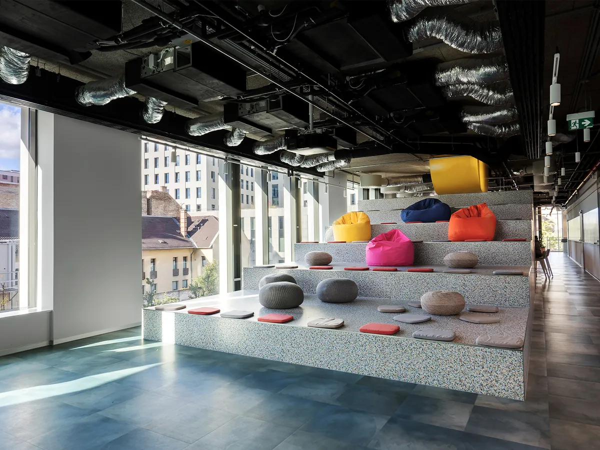 Bár a koncepció elemelkedett, de fontos, hogy nincsen olyan anyag a térben, amely ne lenne ismerős bárkinek. A nyers rétegelt borovi fenyő lemez, az alumínium trapézlemez, vagy a geometrikus mintájú LVT burkolat alkalmazása egyáltalán nem forradalmi megoldás. Az viszont már speciális, hogy hol és mekkora léptékben használjuk őket. A fém trapézlemez vidéki kertek végében található viskók lesajnált anyaga, de egy presztízses irodatérbe helyezve egy húsz méter hosszú egybefüggő falszakaszon megnemesül. A nyomtatott színes mintájú LVT burkolat szintén sajátos karaktert ad az auditórium lelátójának, és ugyanúgy gazdagítja a karaktert a nyers borovi fenyő rétegelt lemez a tárgyalódobozok esetében.