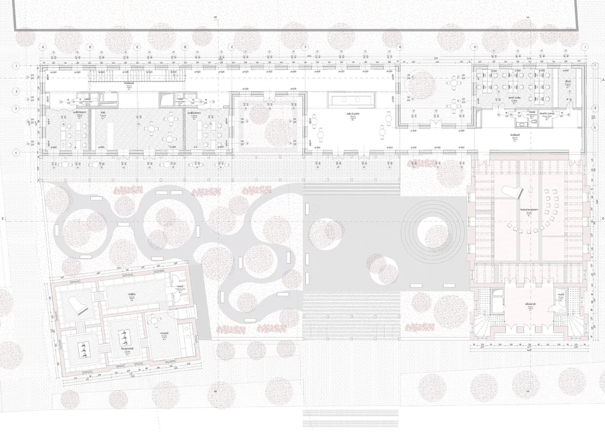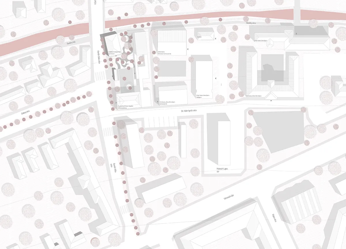 Diplomatervezésem témája egy meglévő zeneiskola bővítés, amely egy egykori zsinagógában működik. A zsinagógát 1882-ben emelték, majd a hitközség növekedésével, az épület egy bővítésen esett át 1920 körül, majd 1944-ben itt alakították ki az I. számú gettót. A háború után az épület funkcióját vesztette, így 1960-ban zeneiskolává alakították. A kezdeti vízió egy nyitott liget kialakítása volt, ami egyfajta múlt rehabilitációként reflektál az épület gettóként való hasznosítására, továbbá lehetővé teszi, hogy az új épületet a telek mélyén, finoman csatlakoztatva az zsinagógához helyezzem el. Az épületben a földszinten közösségi terek, az emeleteken pedig egyéni próbatermek kaptak helyet, míg a zsinagóga földszintjén a hangversenyterem, a visszaállított karzatán pedig egy emléktér található. Az új épület tömege szimbolikus megidézése az egykori tornyoknak; magassága a valamikori tornyokkal megegyező, homlokzatburkolata pedig patinásodó perforált rézlemez, amely anyag a szakrális épületek torony lefedésére jellemző Gyulán. A nyílászárók elé motorikusan mozgatható tolóredőny kerül beépítésre, mely szintén perforált rézlemez fedést kap, így a homlokzat csukott állapotban homogén, tetőszerű képet ad, azonban a perforációnak köszönhetően a természetes fény továbbra is biztosított a próbatermekben. A zsinagóga teljes rekonstrukciója helyett egy „kísérleti” rehabilitációs koncepciót képzeltem el, melyben egyfajta kollázs analógia szerint mutatom be az épület múltjának rétegeit, közösségének történetét. Minden egyes korszakból megidézek valamit a helyreállítás során, például az 1882-es bejárat helyét egy visszaállított vakajtóval, a zeneiskolaként való működésre pedig a burkolat váltakozásával utalok, mellyel a ligetben az egykori hozzáépítés flekkje, a zsinagóga belsejében pedig az elbontott tantermi falak helye rajzolódik ki. Az emléktér sem konkrét kiállítást jelent, itt az épület maga a műtárgy, melynek központi eleme a karzat körbeforduló szintmagas réz cső korlátja. Az elhurcolt zsidók számáról pontos adat nincs, de a legnagyobb szám, amely a visszaemlékezésekben felmerül 600, a réz cső korlátok számossága ezzel megegyező. Összesen 420 név maradt fenn, a nevek egyedi perforációként jelennek meg a korlátokon, s a többlet korlát miatt a koncepció folytatható marad. Az új épületben kortárs terekben tudják elsajátítani a tudást a gyerekek, míg a rabbiház és a zsinagóga úgy telik meg újra élettel, hogy közben az emlékezés fontosságára hívja fel a figyelmet.